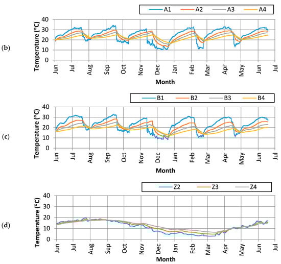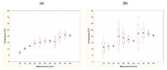 The analysis of valuation results using the Spearman’s (the distribution checked by Kolmogorov–Smirnov) correlation rank test for the calculation model showed a strong convergence of theoretical and actual data (0.91–0.96). Figure 5 presents soil temperature boxplots for selected measurement points. Statistically significant differences (α = 0.05) were determined for points A1–A4, B1–B4, and Z2–Z4. In the winter and summer periods, the significant differences between measurement and calculated data are not noticeable (α = 0.05).