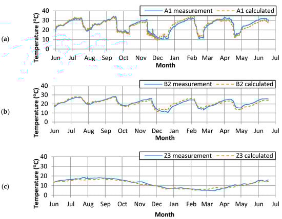 Measured and calculated temperatures in points: (a) A1; (b) B2; (c) Z3.