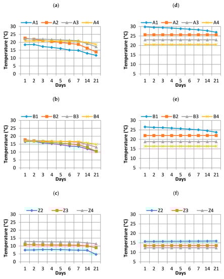 Floor and soil temperatures for technological interruption lasting 1, 2, 3, 4, 5, 6, 7, 14, and 21 days: (a) A1–A4, winter period; (b) B1–B4, winter period; (c) Z2–Z4, winter period; (d) A1–A4, summer period; (e) B1–B4, summer period; and (f) Z2–Z4, summer period.