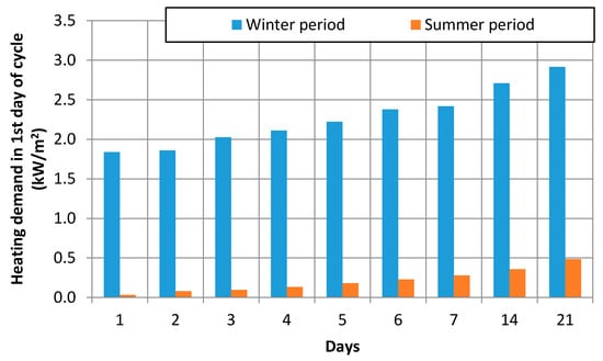 Energy demand for heating 1 m2 of the building floor for the technological interruptions of 1, 2, 3, 4, 5, 6, 7, 14, and 21 days in the winter and summer periods.