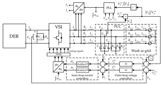 To confront some fundamental problems of the aforementioned ones, in this paper, the nonlinear dynamic behavior of a fully controlled VSI system is studied and reviewed under the case of feeding power from a remotely allocated DER to a weak ac grid. Keeping in mind the difficulties introduced, the main objective is to design novel control schemes to effectively regulate both the ac- and dc-side voltage of the VSI interface and to ensure stable and seamless power transfer to the grid. These particular tasks are accomplished by implementing a cascaded type of control scheme, where inner-loop current regulators are driven by outer-loop ac- and dc-voltage controllers. It must be noted that significant innovations are considered in the whole design: Firstly, the proposed inner-loop control laws are simplified without needing the commonly involved decoupling terms as introduced in conventional designs [19,20]. Hence, their structure is of a pure proportional-integral (PI) type and they provide the power converter duty-ratio inputs in a direct way, avoiding a division by the dc voltage state variable as encountered in common control design practices, whereas extra damping terms are additionally implemented in the integrator loops contributing to system stability without affecting the accuracy of the regulation. Secondly, the PLL drive circuit is suitably modified in order to provide a response independent of the different ac-side voltage variations. This is a crucial design modification, since it makes it possible to effectively connect VSIs in weak ac-grid points. To that end, the ac voltage reference magnitude of the outer-loop controller is used in the PLL instead of the original ac voltage magnitude, while the latter is used only for the angle assignment. It is, therefore, evident that the cascaded controllers’ smooth and stable response is essential to the PLL operation. As a result, the fast dynamics of the inner-loop controllers have to be incorporated into the whole system analysis, since the validation of stability is a fundamental preliminary for the efficient performance of the whole system operation. Indeed, this analysis proves the system overall stability and guarantees that all its states converge to the desired equilibrium.