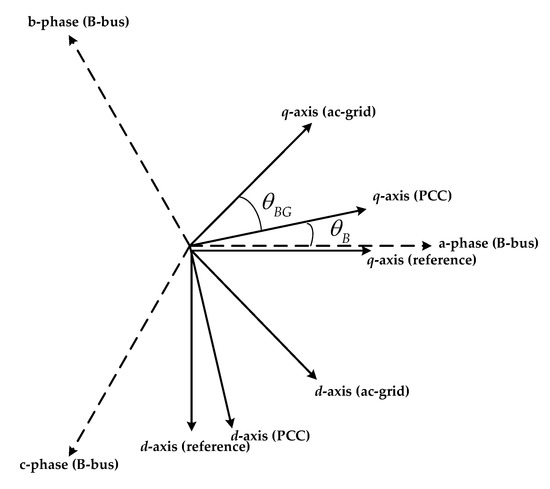 In Figure 2, the PLL operation is explained. In the process of aligning the q-axis reference voltage, it is initially observed that a small angle, , appears between the q-axis reference voltage and the q-axis voltage at the PCC. Obviously, after a transient, both the q-axis bus voltages will be aligned, while a angle exists between the q-axis voltage at the PCC and the q-axis voltage at the infinite bus. Therefore, the grid voltage components become: