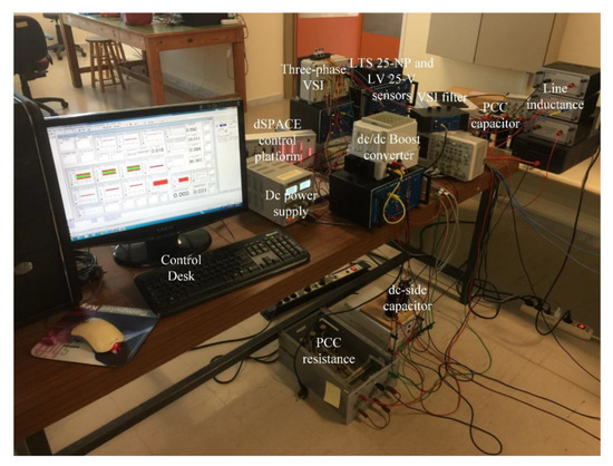 In order to further evaluate the performance of the system under the action of the deployed closed-loop control scheme, an experimental procedure is also established based on the complete system of Figure 1. In particular, the experimental setup comprises a dc/dc boost converter representing a DER current source feeding a three-phase VSI. The VSI is connected through an RL filter to the PCC, which in turn is connected to the grid via an RL line. The setup as developed in the laboratory environment is illustrated in Figure 3.