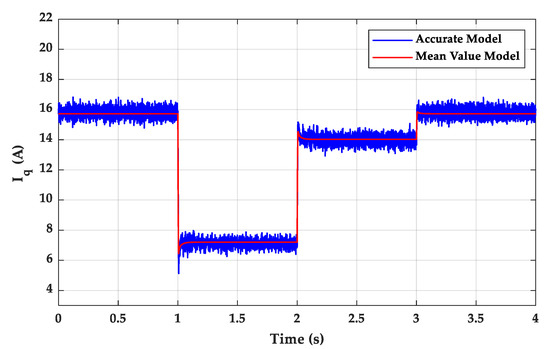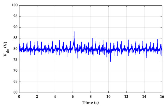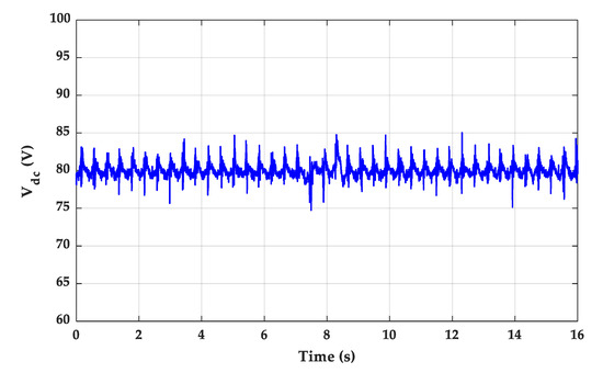 In Figure 9 and Figure 10, the q- and d- current components are shown, while in Figure 11 and Figure 12, the dc and ac voltage responses are depicted. It can easily be seen that the current follows the command input changes, while both the dc- and ac-voltages remain at the desired value. Only limited transients are observed during the external input changes, indicating that the proposed control scheme effectively retains the steady-state operation.
