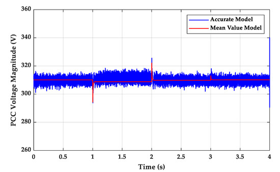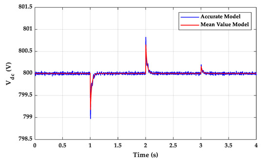 In Figure 6 and Figure 7, one can see the fast and effective ac- and dc-voltage regulation on the weak ac-grid and the dc-side, respectively. As expected, a small difference is observed in the dynamic response of the system between the mean-value and the accurate model. It is also noticed that the mean value model used for the VSI is closer to the real model as the switching frequency increases.