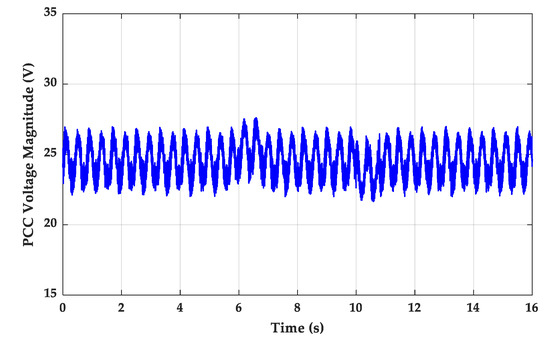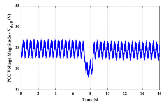 In Experiment 2, a grid-originated voltage disturbance is studied. In particular, a sudden grid-side voltage drop is introduced at approximately t = 7 s into the experiment. The main aim is to evaluate the outer-loop ac voltage controllers’ performance in terms of effectively regulating the PCC voltage at the desired steady-state value and the PLLs capability to maintain synchronism with the utility.