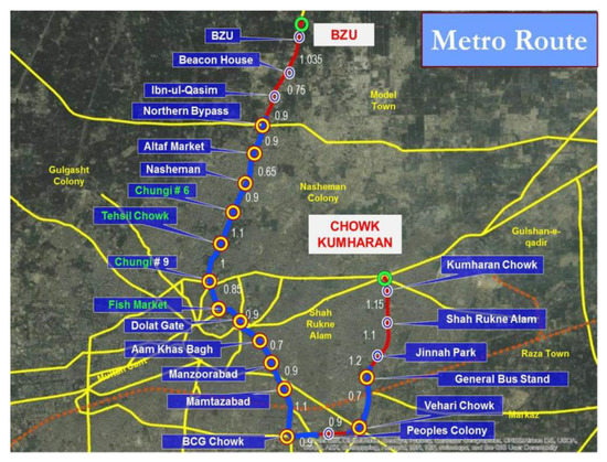 The city of Multan (known as the city of saints) is the seventh-largest city of Pakistan and is located in the south region. It covers 132.1 sq. km of area. Multan had a population of 1.31 million in the 1998 census, but it has increased up to 1.87 million in 2018 [27]. This means that Multan has an average growth rate of 2.6% annually. It is often called the city of saints. Multan has a critical condition in terms of income and inequality. The city is small and is overpopulated; thus, the road system is bearing a burden that causes a lot of problems for the inhabitants. It also causes problems like congestion, accidents, pollution, etc. Hence, the government has decided to overcome this problem in Multan by the development of the BRTS. The traffic route planning was poor, which caused the failure of the BRT system in Multan. The BRT system of the Multan corridor is approximately 18.5 km in length, which has been developed for the cost of 200 million United States dollars (USD). It also consists of 21 stations variable in length. Some of the sections are located at ground level and the rest is elevated. The elevated portion is 6.5 km, while 12 km are at grade level. The Multan BRT system carries 5–10 thousand persons daily, which is considered to be a good number of passengers. The BRT system consists of different types of corridors such as the feeder, stops and stations, access to a pedestrian, and main and other terminals along a control center unit. The BRT Route plane is shown in Figure 3.