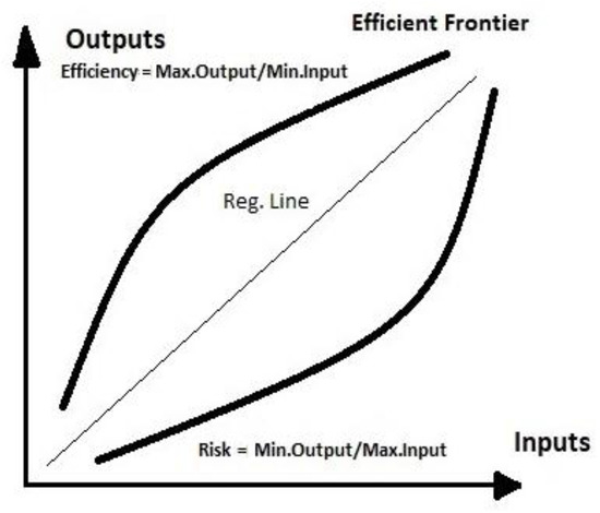 DEA model and efficiency level are calculated by applying the performance analysis outcome and exposure variables [32,33]. In Figure 5, the formation of the DEA model can be explained according to the two concepts. If the output is desired, it should be maximized for the calculation of efficiency, while minimizing output is required for the calculation of risk. Due to its benchmarking formulation, DEA is considered superior with reference to the regression technique.