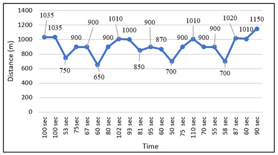 From the analysis of these data, as shown in Figure 7, it was found that, at the distance of 1035 m, the first station was located. The time consumed was about 100 sec, which was the double of the Manzorabad location. Northern-By-Pass and Shalimar Colony have constant distances of 900 m with a difference of 8 sec in the time period. The time duration suddenly leaped at BCG Chowk to 110 sec with a 1010-m measured distance, and then varying until the last station. Hence, larger distances between the stations degraded the BRT performance.
