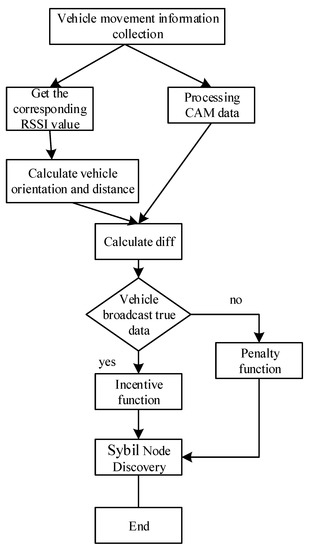 where refers to the excitation function when the data packet sent by the target vehicle is trusted , and is the penalty function of the trust value when the vehicle attacks, . If the vehicle sends out false data packets, the trust value of the target vehicle will drop rapidly. The greater the number of attacks, the larger the penalty factor, and the faster the target function will be put into the blacklist. The flowchart of Sybil node discovery based on the punishment incentive is shown in Figure 3.
