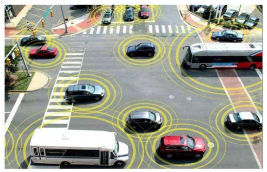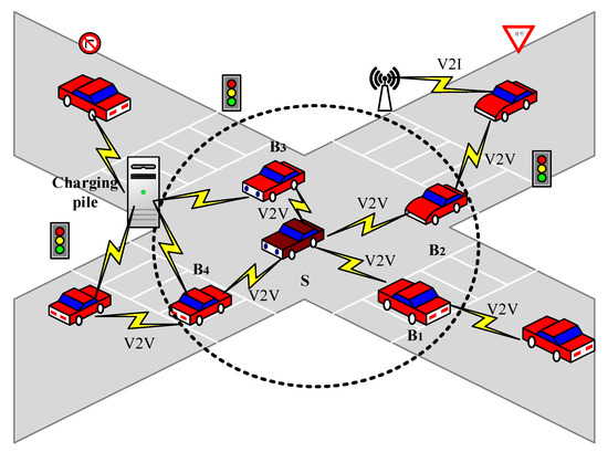 In the vehicle-connected network architecture, there are two communication modes for vehicles: Vehicle-to-vehicle (V2V) communication and vehicle-to-infrastructure, such as charging pile (V2I) communication, as shown in Figure 4 below. Each vehicle is connected in the vehicle-connected network architecture. Both the fast charging pile and the fast charging pile are regarded as a mobile node. Within a certain communication range (generally a radius of 300 m), the dedicated short range communication (DSRC) transmits its own CAM data packet while inquiring other vehicles about the CAM data packet to obtain a series of road conditions and roads. Traffic information and its road map is shown in Figure 5 below, which improves driving safety, reduces congestion, and improves traffic efficiency.