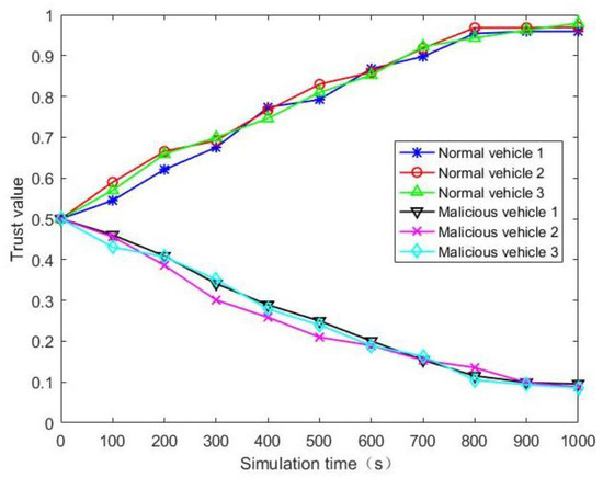 Figure 8 shows the changes in the trust values of the two normal and malicious nodes selected. With the detection of the vehicle during the simulation time, the trust value of the normal vehicle is continuously rising. At 1000 s, the trust value is about 0.96. Assuming the threshold is 0.5, the vehicle is a trusted vehicle. At 1000 s, the trust value of a vehicle is about 0.1, which is far below the credibility threshold. The vehicle is a malicious vehicle. It can be seen that the detection model can detect malicious vehicles with a trust value below a threshold.