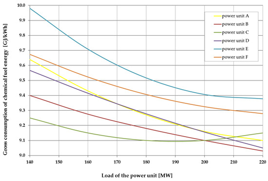 In order to estimate the benefits resulting from optimization of the power unit operation of the analyzed coal-fired power plant, the operational characteristics were used. These characteristics show the dependence between the gross fuel (coal) consumption per unit of electricity produced and the power unit load. This relationship for the individual power units is presented in Figure 1. It results from the dependency that the optimal operating point of the power units is near the nominal load of 220 MW.