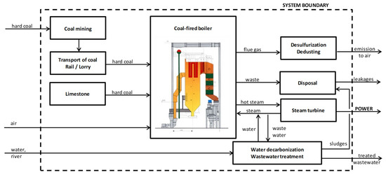 The data for the electricity production process at the power plant were obtained directly from the operator of the analyzed coal-fired power plant. The secondary data were used for other processes. Namely, the data for the upstream and downstream processes were taken from the ecoinvent database: coal mining in Poland, road and rail transport of coal over a distance of 100 km, limestone production, water decarbonization, wastewater treatment, management of sludge from decarbonization and wastewater treatment processes, and management of waste from burning.