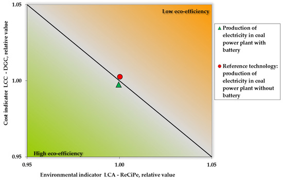 The calculation results indicate that the production of electricity in a coal-fired power plant with the use of the battery is more eco-efficient than without using the battery. However, the difference is insignificant. This is illustrated by the graphic interpretation of the results presented in Figure 3.