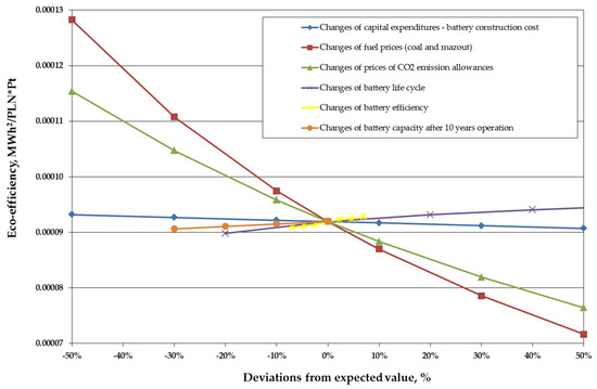 The results of the sensitivity analysis allow the determination of the following hierarchy of impact of the individual determinants on the eco-efficiency index value for the electricity production technology in a coal-fired power plant using a battery (from the highest to the lowest):
