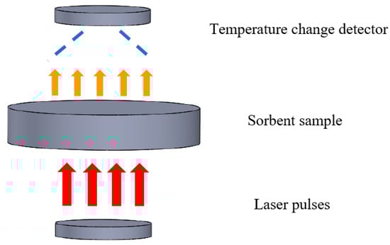 The thermal diffusivity of material is related to the time to reach thermal equilibrium under variable thermal conditions. The tests were carried out on an LFA 457 MicroFlash (Netzsch-Gerätebau GmbH, Selb, Germany). A sample of a test plate-shaped material was placed in a holder and “closed” from the outside with spacers made of a material with known properties, e.g., aluminum. The sample was subjected to a heater to determine the desired measurement temperature, and then a laser light pulse of known energy was directed toward the sample. From the moment of exposure, the time and temperature on the other side of the sample were recorded. The scheme of thermal diffusivity measurement using the laser flash method is shown in Figure 1.