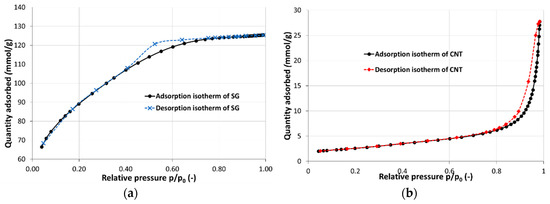 The N2 equilibrium adsorption points were determined using the LPNA method. From these measurements, the adsorption isotherms were plotted, which are shown in Figure 2a,b. The silica gel adsorption isotherm (Figure 2a) represents a type I adsorption material, according to International Union of Pure and Applied Chemistry (IUPAC) [77], and is similar to a Langmuir isotherm. This shape of the isotherm indicates that as the concentration of the N2 adsorbate increased, the active centers became gradually saturated, and the adsorption process decreased. This isotherm shape is typical for materials with many micropores in their porous structure. Carbon nanotubes, which were added to the silica gel, produced a type II isotherm (Figure 2b) [77].