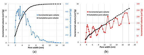 Figure 3 contains the incremental and cumulative pore volume distribution as a function of pore diameter according to the non-localized density functional theory (NLDFT). This theory is based on the Tarazona approach [75,76], which is used to calculate the pore size distribution of carbon, zeolites, pillared clays, and other porous materials. In silica gel, the pores with a diameter in the range of 2–6 nm had the largest volume (Figure 3a), which puts them within the range of the narrowest mesopores (2–50 nm). In the CNTs, the largest increase in pore volume was in the range of 11-18 nm, which is shown in Figure 3b.