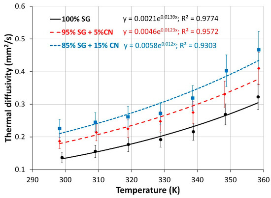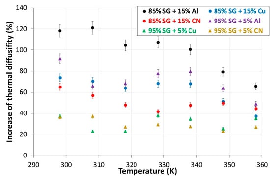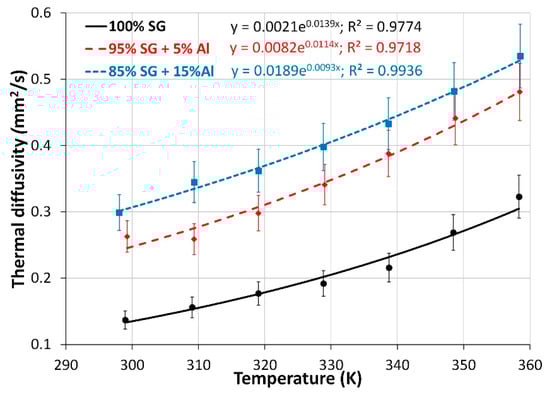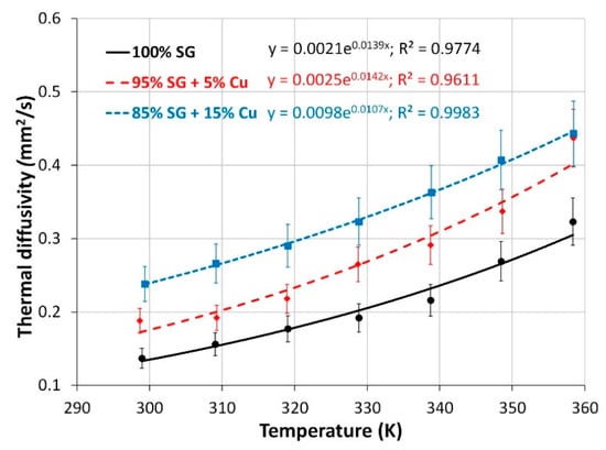 The highest thermal diffusivities were reached for additive contents making up 15 wt% of the mixture, and were equal to 0.444 mm2/s, 0.535 mm2/s, and 0.467 mm2/s, for Cu, Al, and CNTs, respectively (Figure 4, Figure 5 and Figure 6). Thus, the highest thermal diffusivity of the blend was obtained for the addition of 15 wt% alumina particles.