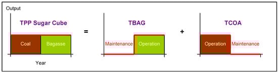 The operating windows for the two single-fuel units in this example have been defined so that the units cannot be used simultaneously. This was implemented by using the feature of WASP that allows the user to specify plant maintenance schedules, so that the two units were scheduled to be shut down for maintenance in complementary six-month intervals. The sum of outputs from TBAG and TCOA units adequately represents the total output of TPP Sugar Cube, also allowing for accurate accounting of the consumption of both fuels.