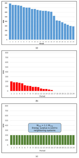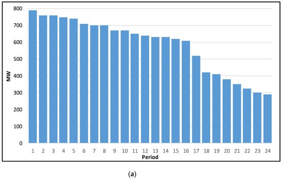 As shown in Figure 4, which represents the daily LDC in Kosovo’s power system for a sample day, the daily load diagram is characterized by a considerable difference between the minimum and maximum load, resulting in a relatively low load factor. Importing peak energy contributes to the reduction of system peak load. In return for peak electricity imports, the first co-operation scenario A envisages electricity exports from Kosovo during periods of low demand. The result of such co-operation would be a reconfigured, more convenient daily load duration curve [] to be met with by the thermal generator portfolio of the Kosovo system, as shown in Figure 4.