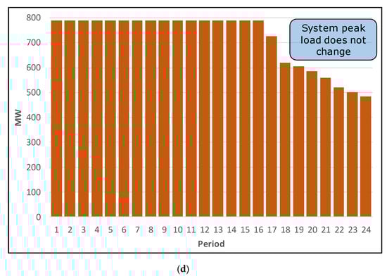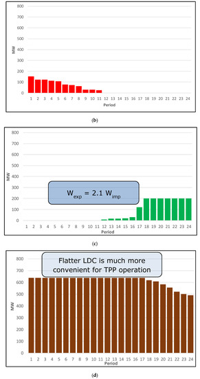 Alterations in resulting system LDC for scenario B: (a) Daily LDC, (b) peak imports, (c) off-peak exports, (d) new LDC.