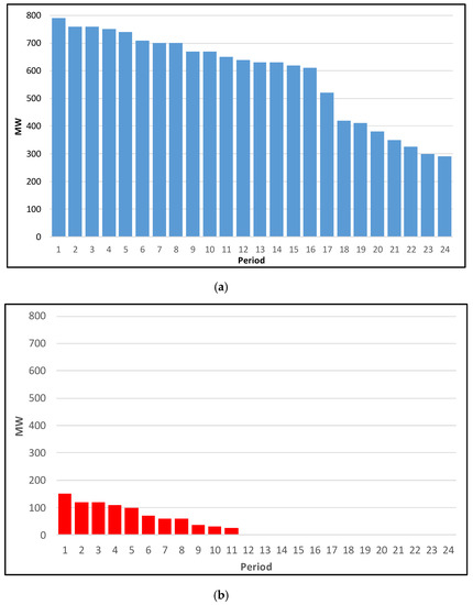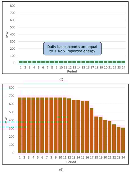 Simulating such co-operation was implemented in the WASP model by introducing a pumped storage hydro (PSH) power plant [,]. Its parameters were set in the way that its capacity in both turbine and pumping mode was made equal (150 MW), while its monthly generation was limited to 20 GWh, and its cycle efficiency was set to 47.6%, which represents the ratio between the volumes of off-peak exports and peak imports (or 1/2.1).