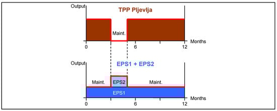The modeling solution to this problem involved several steps. First, two thermal units were defined: EPS1 and EPS2, Figure 7, both with the maximum capacity of 105 MW. Their variable O&M costs (equivalent to the import prices) were set to zero, in order to position them at the bottom of the merit order, i.e., to ensure that they ‘produce’ with the maximum capacity. Furthermore, for the first plant (EPS1) the duration of scheduled maintenance was set to zero days, while for the second one (EPS2) it was set to 303 days (i.e., 1 year minus 2 months). This maintenance period for EPS2 had to be placed in the correct periods of the year. This was done through user-specified maintenance scheduling available in MERSIM module of WASP, so that 30 days of maintenance have been specified in each month except April and May. Similar to that, the maintenance schedule for TPP Pljevlja was also specified, complementary to the one of EPS2, i.e., covering 60 days of April and May. The procedure is depicted in Figure 7.