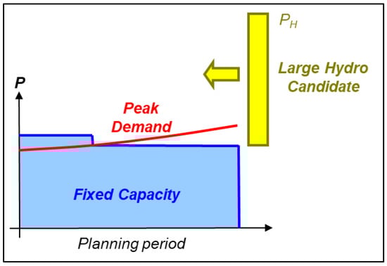 As already mentioned, Montenegro has a relatively small power system with a peak demand of around 750 MW. One of the issues with building new hydro-power plants is that many of the proposed projects have rather high installed capacities for a system of that size, exceeding 300 MW, or in some cases even 500 MW. Levelized costs of some of these projects are lower than the competing supply options such as imports. However, because of their size, such plants do not ‘fit’ well into the small system. Economically, their construction is avoided or pushed towards the end of the planning period, because of large investments needed for their construction [,,]. On the other hand, forcing these plants into the system, apart from adding large investment cost to the objective function, is likely to result in energy spillage in some periods of the year, since the system demand is insufficient to absorb such a large amount of energy. This situation is illustrated in Figure 8.