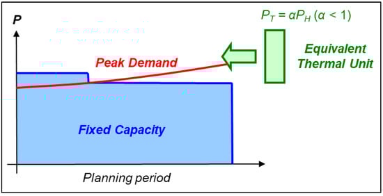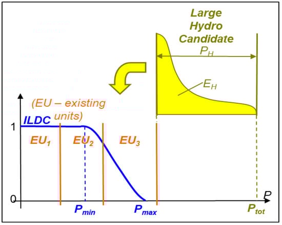 The problem of fitting a large hydro plant into the LDC of a small system is shown in Figure 10. The capacity factor of the hydro plant in this example is relatively small, but the total capacity after adding the hydro plant (as well as the resulting capacity margin) becomes very high. The annual output of the hydro plant () and the duration curve of its generation are also shown in Figure 10.