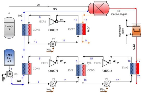 The type of marine engine is Wärtsilä 50DF, which is a four-stroke, non-reversible, turbocharged and inter-cooled DF marine engine with direct injection of liquid fuel and indirect injection of gas fuel. The engine can be operated in gas mode or diesel mode. In this study, the primary parameters of the Wärtsilä 50DF marine engine are summarized in Table 2. About 50% of fuel energy is converted into the propulsion energy power for the marine engine, while the other 50% is taken away by the waste heat. There are two main forms of waste heat: (1) high temperature EEG generated by fuel combustion; (2) JCW that is used to remove the excess heat of main engine and guarantee proper working temperature. In the meantime, the LNG vaporization process releases a large amount of cold energy.