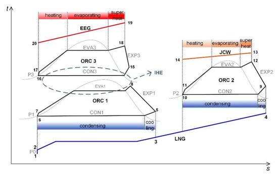 The cold energy and waste heat from the DF marine engine are converted into electrical energy with the combined ORC system. In order to avoid the efficiency decrease of heat transfer between large temperature difference, a combined ORC system based on energy cascade utilization principle is proposed, which is illustrated in Figure 1. LNG, used as fuel, requires gasification before entering the DF marine engine. The outlet temperature of EEG from the DF marine engine is usually higher than 300 °C. After flowing through the boiler circulation, the temperature of EEG is still higher than 150 °C. JCW of the DF marine engine is generally with the temperature in the range of 78–95 °C. Therefore, EEG and JCW from the DF marine engine work as dual heat sources for the combined ORC system. The t-s diagram of the combined ORC system is shown in Figure 2.