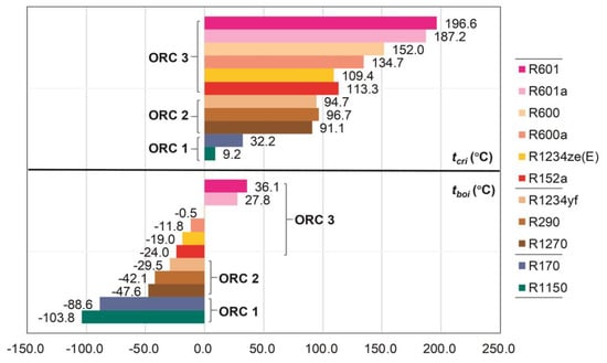 To satisfy the requirements of environmentally friendly WFs, only refrigerants with zero ozone depletion potential (ODP) and global warming potential (GWP) less than 200 are considered in this study. By considering the characteristics of the heat source and cold source, 11 candidate WFs were selected for the combined ORC system. The physical parameters of the selected WFs are presented in Table 4. The classification, environmental and safety indicators are also shown in Table 4. Since the tboi relates to WF phase change and the critical temperature (tcri) limits the working region, the tboi and tcri of different WFs are illustrated in Figure 3. Considering system safety and stability, the matching relationship of WFs with different ORC subsystems was determined. R1150 and R170 are recommended for ORC 1 since they have lower tcri. R1270, R290 and R1234yf with higher tcri are used in ORC 2. R152a, R1234ze(E), R600a, R600, R601 and R601 are used in ORC 3 since their tcri are close to the temperature range of EEG. Therefore, a total of 36 cases would be produced by all possible combinations.