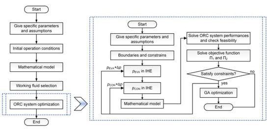The calculations of thermophysical properties of WFs and energy balance are implemented in Aspen Hysys (V9.0, Aspen Tech, Bedford, MA, USA). The PR (Peng-Robinson) equation is used in the simulation process. However, the optimization capacity of Aspen Hysys V9 is very limited. Considering the convenience of optimization toolbox, the optimization of the ORC system was realized by MATLAB (2017b, MathWorks, Natick, MA, USA). By adjusting the interactions between thermophysical properties and operating parameters of the combined ORC system, the calculation procedure of the optimization parameters is shown in Figure 5. Firstly, specific parameters and basic assumptions were given. The corresponding component and the energy, exergy and economic model were established. Secondly, ORC performance simulation was carried out under the initial conditions to determine the optimal WFs combinations for further study. Thirdly, the boundaries and constraints for the specified WF combination were set. The evaporation pressure and condensation pressure increased gradually within the specified scope. For each loop, the performance criteria and the objective functions were calculated. Finally, the optimization was carried out and the Pareto solution was obtained. Values of important parameters in GA are presented in Table 9.