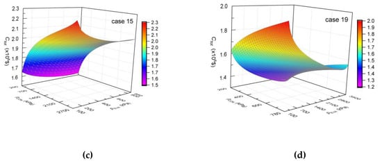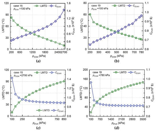 Figure 10 depicts the variations of the Logarithmic Mean Temperature Difference (LMTD) and the cost of EVA1 (CEVA1) for case 15 and case 19. As shown in Figure 10a,b, the LMTDs for the two cases have the same behavior of a decreasing trend with the increase of pCON when the pEVA remains at 100 kPa. In addition, the LMTD variation of case 15 is more dramatic than that of case 19. The LMTD of case 15 and case 19 varies in the range of 10.1–82.7 °C and 17.1–60.3 °C, respectively. The decrease of LMTD would lead to an increase of EVA1 heat transfer area, and thus result in CEVA1 increase. As shown in Figure 10c,d, the LMTD increases with the increase of pEVA when the pCON maintains at their highest pressure. The LMTD of case 15 increases from 10.1 °C to 90.6 °C when the pEVA increasing from 100 kPa to 850 kPa. The LMTD variation of case 19 is larger than that of case 15, which changes from 17.1 °C to 145.9 °C when the pEVA varies in the range of 100 kPa to 3500 kPa. The CEVA1 decreases with the increase of pEVA and the results are in accordance with the results shown in Figure 7c,d.