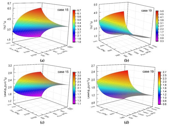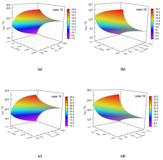 ηen and ηex with variation of pressures. (a) ηen for case 15; (b) ηen for case 19; (c) ηex for case 15; (d) ηex for case 19.