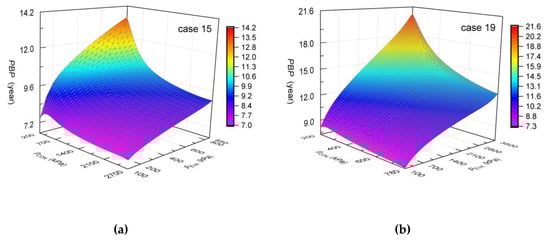 The trend of payback period (PBP) for case 15 and case 19 is displayed in Figure 9. The PBP of case 15 and case 19 varies between 7.0–14.2 years and 7.3–21.6 years, respectively. Even though the system total cost of case 19 is less than case 15, the PBP of case 19 is much longer than case 15. The reason can be attributed to the lower output power and lower energy utilization efficiency, which are illustrated in Figure 7 and Figure 8, respectively. The higher the pCON is, the shorter the PBP is. The higher the pEVA is, the longer the PBP is. These results can prove that the variation trends of output power and system cost are correct.