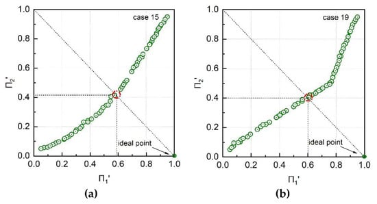 Based on the two selected WF combinations of different evaporation pressures and condensation pressures, the combined ORC system is optimized under the fixed heat source and cold source. The objective function Π1 regarding energy and exergy utilization should be maximized while the objective function Π2 regarding cost and payback period should be minimized. The Pareto front and the optimal results of the two normalized objective functions calculated by NSGA-II iteration are demonstrated in Figure 12. The Pareto optimization results illustrate the conflict between the two objective functions. After Π1 reaches a certain value, Π2 increases sharply. In this paper, the most favorable point in the Pareto front was defined as the minimum normalized distance to the ideal point, i.e., the end of the x-axis. Thus, optimized working conditions and results for three cases were respectively decided, which are listed in Table 12. Although case 19 has a lower investment, the payback period is longer than that in case 15. Moreover, case 19 does not have any advantages either in output power or in thermal indicators. With the optimized working conditions, Π1 is 4.74% and 2.26% for case 15 and case 19, respectively. Π2 for case 15 and case 19 is 2.55 × 105 $/year and 1.67 × 105 $/year, respectively.