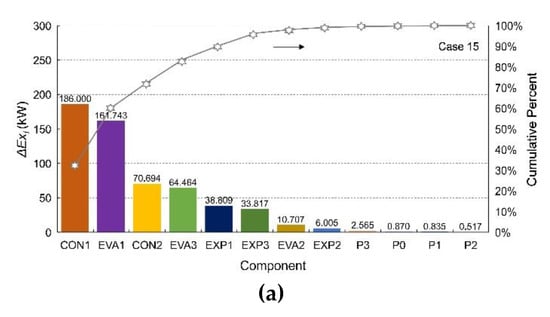 In order to have a further understanding of the combined ORC system, the exergy destruction and cost of each component are analyzed under the optimized working conditions. The chart of the exergy destruction of each component in the combined ORC system is illustrated in Figure 13. In all cases, the exergy destruction mainly occurs in the heat exchangers. The exergy destruction in CON1 accounts for the largest part (up to 40%) of system exergy destruction. The reason is given to the large temperature difference between LNG evaporation temperature and WF1 condensation temperature. Limited by the required pressure of DF marine engine, the corresponding temperature of LNG is −134.6 °C. The optimized condensation temperature of the selected WF1 for case 15 and case 19 is −103.8 °C and −88.6 °C, respectively. Therefore, future work could be carried out in the optimization of CON1. The second place of exergy destruction goes to EVA1. Therefore, it proves true that the study of pressure variation in EVA1. The exergy destruction in EVA1 for case 19 is larger than that for case 15, which is mainly caused by the larger LMTD as shown in Table 10. Comparing Figure 13a,b, we can draw the conclusion that the matching degree in EVA1 for case 15 (R1150 and R600a) is more reasonable than that for case 19 (R170 and R152a). Compared to case 19, the exergy destruction in EVA1 for case 15 could be reduced up to 18.99%. In addition, the exergy destructions in pumps are relatively small.