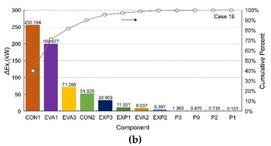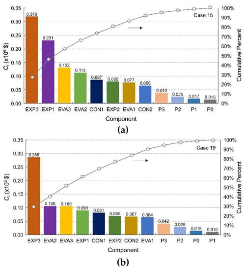 The cost of each component cost and its ratio to the system total cost are demonstrated in Figure 14. Under different cases, the proportion of component cost is different. The costive components are generally expanders. For example, the cost of expanders in case 15 account for more than 50% of the system total cost. Meanwhile, the cost of expanders reflects the contribution of different ORC stages to the system net output work. The output work is sorted as ORC 3, ORC 1 and ORC 2 for both cases. The cost of heat exchangers basically depends on the area of heat exchanger. EVA3 and EVA2 is the most costive heat exchanger for case 15 and case 19, respectively. The reason could be attributed to its large heat transfer area caused by small LMTD between working fluid and heat source. Similarly, the proportion of CON2 cost could be explained as well. Based on the optimized working conditions, the proportion of EVA1 cost is small, which is 3.9% and 4.08% for case 15 and case 19, respectively. The cost of all pumps accounts for 4.90% and 6.06% for case 15 and case 19, respectively.