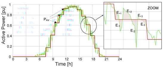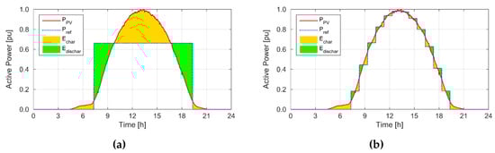 Battery power was selected so as to ensure that the contribution of the hybrid PV-BESS system to the common scheduling unit is kept constant over an hour and as close as possible to the scheduled average power level. To comply with this requirement in each analyzed period of time Δt, BESS rated power must be at least equal to the maximum commanded power, i.e., the difference between power generated by the PV system (PPV) and the set hourly average power (Pref). Subsequently, the rated real power of the BESS Pn is determined as: