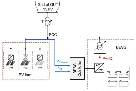 A power grid model with BESS representation, based on work by Kottick et al. [35], Medora and Kusko [36], Barsali and Ceraolo [37] and embedded in the Power Factory software [38], was applied in simulations, and a PV model was added. The power of PV-BESS hybrid system was controlled at the point of common coupling (PCC). The topology of the test power system is presented in Figure 3.
