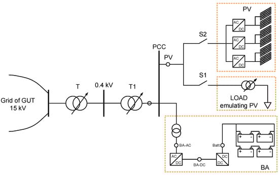 The schematic diagram of a test system with PV emulator by laboratory load model based on power frequency converter or with PV power plant. T: power transformer 15/0.4 kV/kV, T1: transformer of the hybrid PV-BESS system.