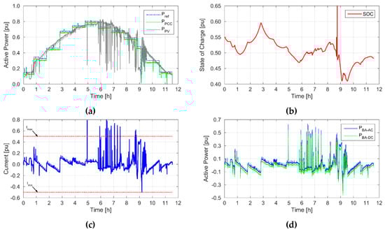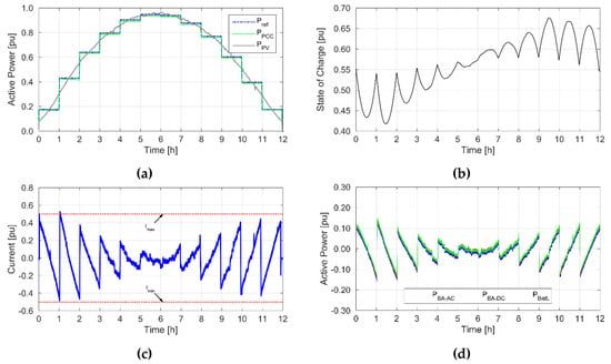 The battery power waveforms (Figure 10a) show what power the adjustment required in periods of cloud cover in the afternoon. The highest discharge power was 0.62 pu and the charge power was 0.46 pu. The above forced the battery current flow (Figure 10c) to reach a maximum of 0.8C - a value that is greater than the 0.5C limit. However, this did not cause the battery to be disconnected. In the case of a lithium-ion battery, the operation with currents higher than 0.5C for a long time will not result in surpassing the permissible operating states. The critical moment from the point of view of the test was the occurrence of heavy cloud cover (about ninth hour of the experiment). A significant reduction in PV generation resulted in an increase in battery power transferred to the system. In order to avoid decreasing the SOC to the values below 0.4 pu, a significant adjustment of Pref was introduced. This enabled fast rebuilding of the energy potential of the storage for further regulation.
