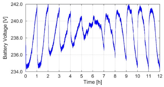 In relation to the rated power of the hybrid power plant, the largest share of battery power was 0.15 pu. Figure 8 shows the variability of battery voltage with characteristic sudden voltage changes occurring at full hours of the experiment. This behavior is related to the change in the power setpoint of the hybrid power generation system (Pref) and thus the transition between charging and discharging modes.