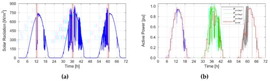 The curves used to develop a battery operation schedule, registered from 23 to 26 July 2018: (a) solar irradiation (red bar indicates the time of the day, when the insolation measurement system is overshadowed by other objects installed on the roof of the laboratory), (b) per-unit power output of PV system.