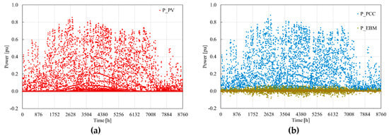 The yearly profiles of (a) the power generated by PV system PPV, (b) the power at the point of common coupling PPCC and power exchanged with the electricity balancing market PEBM (all related to PV system rated power). Own illustration based on PV GIS data on solar irradiation for LINTE^2 location.