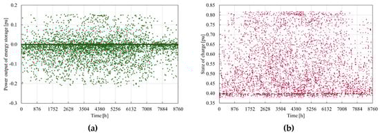 In Figure 12, the battery operation yearly profile was presented along with the characteristics of the state of charge at the beginning of each hour of the analysis first year. One should note that during one hour SOC may vary, increasing the number of both charging and discharging operations the battery should perform. There are instances of trespassing the thresholds of SOCmin and SOCmax, which result from the one-minute resolution of power generation profile that may enable to discharge the battery below minimal SOC and to charge it above the maximal accepted SOC, since the decision is made on the basis of the SOC at the end of the minute preceding charging or discharging operation. Further increase in the resolution of the calculations and application of predictive control would solve this problem. However, it would also lead to the computation time extension.