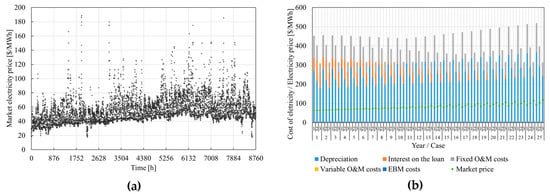 Selected data presenting the Polish electricity market: (a) the yearly profile of electricity market price (own illustration based on the data from Polish power exchange TGE SA [49]) and (b) cost of electricity generation and weighted average electricity market price.